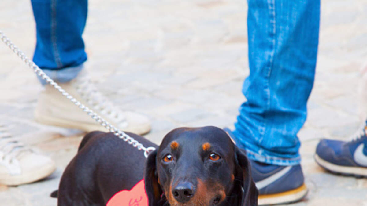 Frankie, a 6-year-old mini Dachshund, runs around to help round up a new mob of sheep on the farm in a pen.