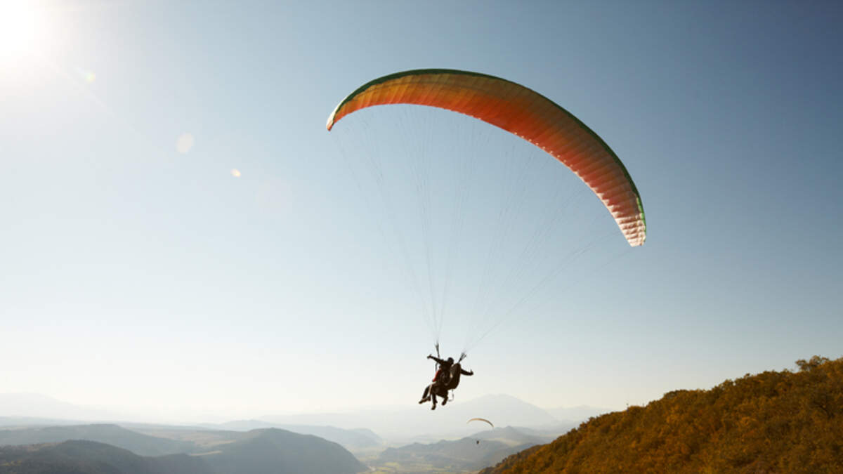 Person records his point of view of an exciting skydiving while paragliding experience.